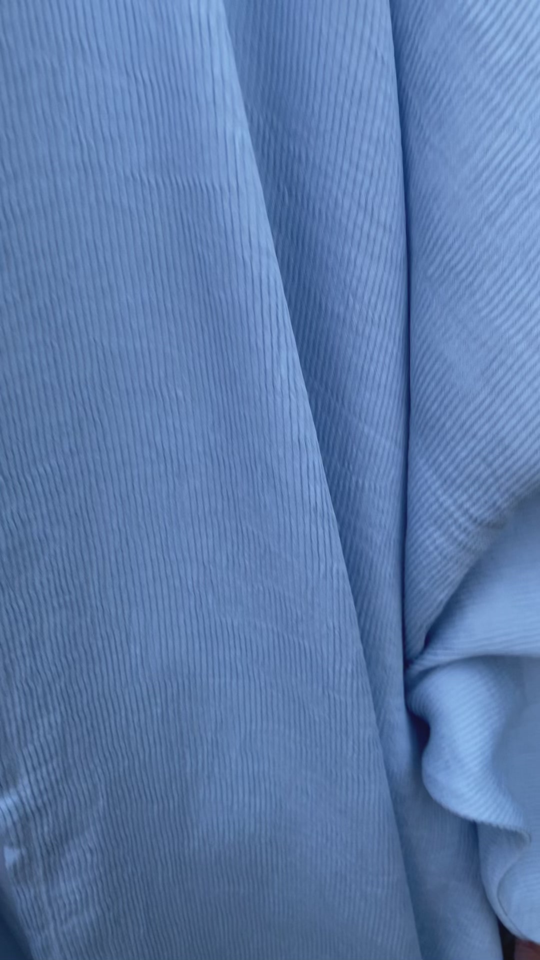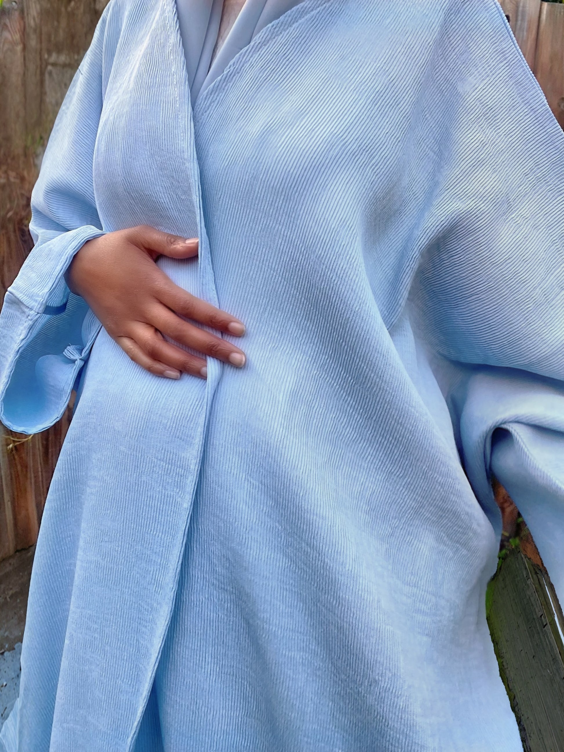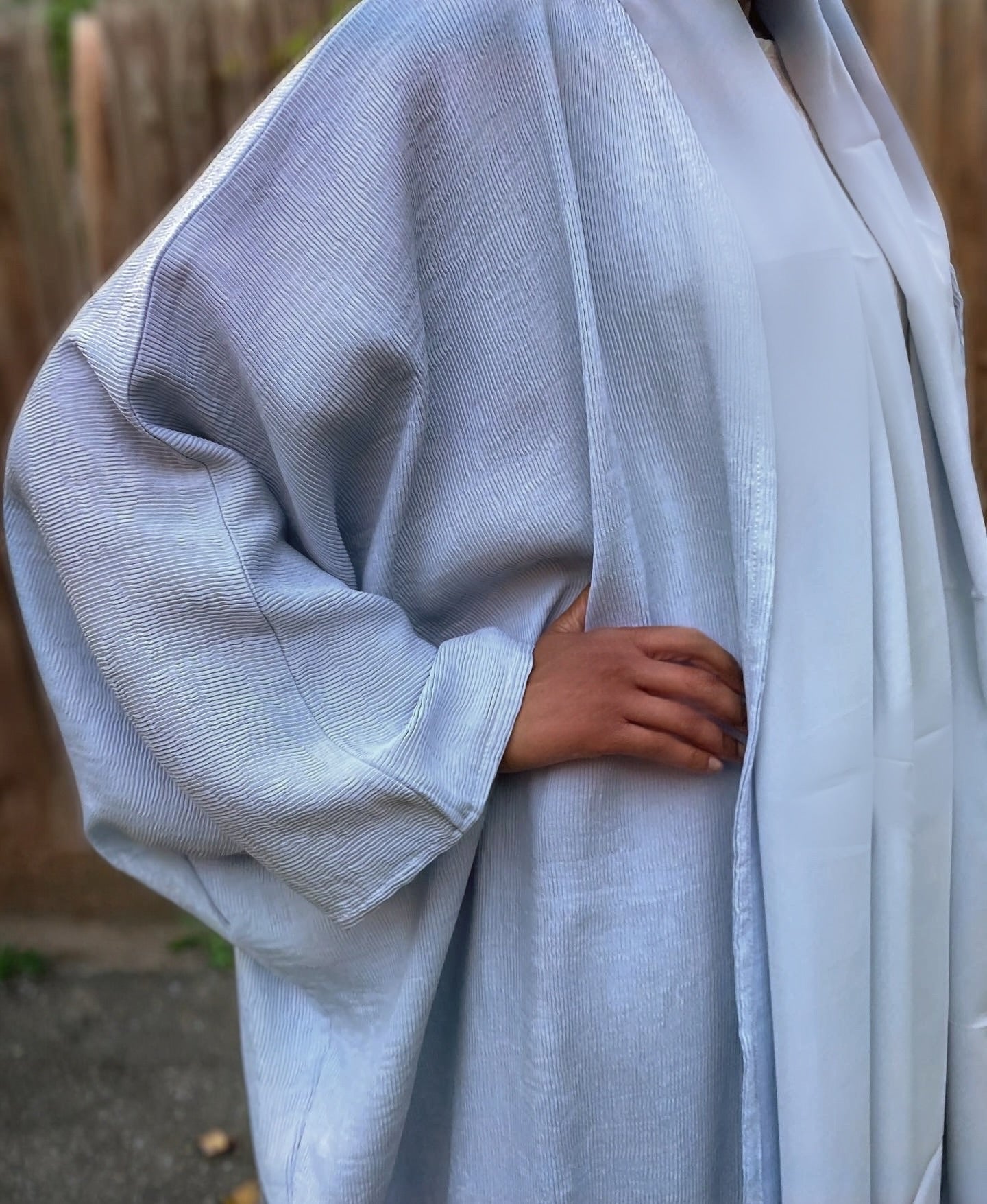 Pale blue textured Cotton Abaya with matching hijab. This abaya is designed to create the most flattering silhouette and suit a range of body types.